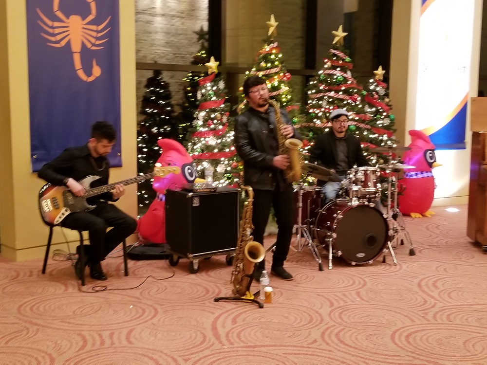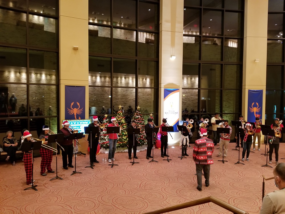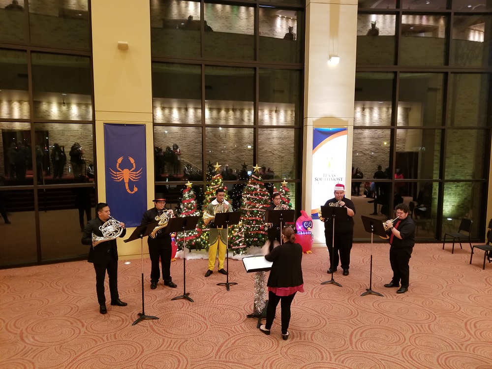 The night of holiday music began with a pre-concert music in the lobby by the UTRGV Trombone Choir to entertain the audience until the auditorium doors opened. The night’s first half of the concert series consisted of the UTRGV Master Chorale singing This Endris Night and What Sweeter Music, the UTRGV Symphony Orchestra performing holiday classics like How the Grinch Stole Christmas and Stille Nacht. The intermission entertainment came courtesy of the UTRGV Horn Choir and for the second half of the evening’s performances, the UTRGV Master Chorale and UTRGV Wind Orchestra performed such classics as Sleigh Ride and The Christmas Song and the UTRGV Wind Orchestra performed The Polar Express and The Bells of Christmas, among other holiday favorites. The audience participation portion was a holiday sing along with the UTRGV Master Chorale and Wind Symphony of Deck the Hall, Jingle Bells, O Christmas Tree and We Wish You A Merry Christmas. The UTRGV Jazz Combo kept the momentum going in the lobby with a post-concert performance.