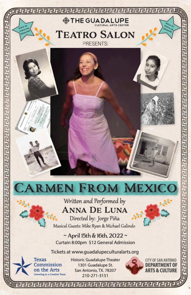 The Guadalupe Cultural Arts Center’s Teatro Salon proudly announces the return of Anna De Luna’s original solo performance of ‘Carmen From Mexico.’ Scheduled for April 15 and 16, 2022 at the Guadalupe Theater, 1301 Guadalupe St., curtain is at 8 p.m. with general admission of $12. ‘Carmen From Mexico’ was presented as a world premiere at the historic Guadalupe Theater in 2021 to sold out audiences. Tickets are available here. Teatro Salon is a project of the Guadalupe Cultural Arts Center that showcases and helps develop new work by theater artists. (Teatro Salon, 2022)