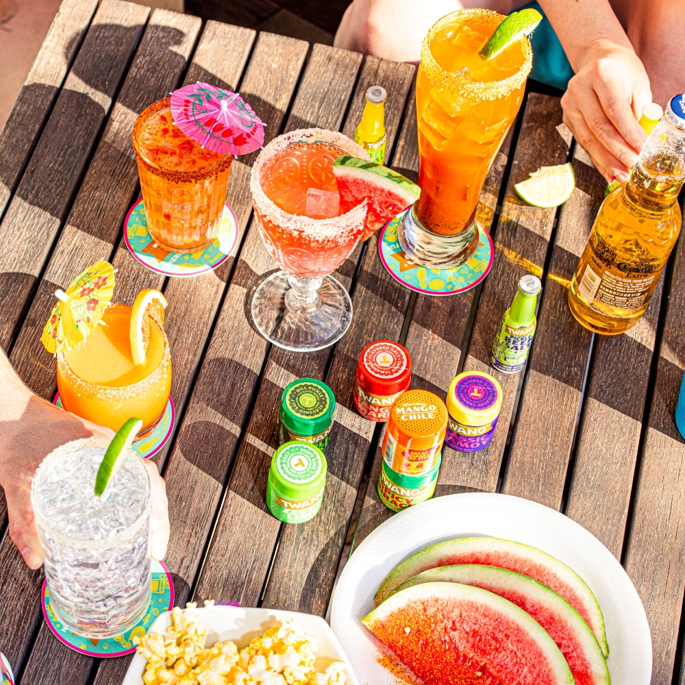 - Rim the glass with Twang’s Lime Drink Rimmer or your favorite Twang seasoned salt