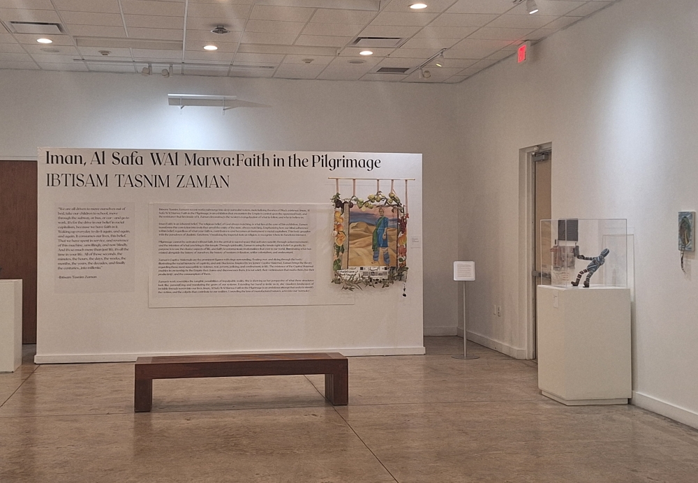 Ibtisam Tasnim Zaman’s solo exhibition, ‘Iman, Al Safa WAl Marwa: Faith in the Pilgrimage,’ is a feature of works that use figurative surrealism to narrate the layers of systemic structures. A constant state of revealing ‘manufactured nature’ through everyday life: in the mundane, journey to work, and overall culture of normalization. Zaman contrasts these dense realities, through depicting acts of intimacy, tenderness, paradox of motherhood, and love as acts of resistance in the midst of chaos.