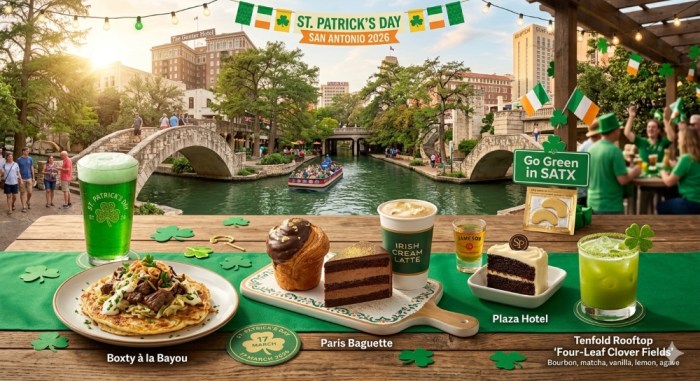 St. Patrick’s Day (March 17) is just around the corner, and San Antonio is painting the town green! From Guinness-infused desserts to Pantone-inspired rooftop cocktails, several standout spots across the city are rolling out the red—or rather, green—carpet for the holiday. (The Gunter Hotel, Plaza San Antonio Hotel & Spa, Kimpton Santo San Antonio – Riverwalk, 2026).