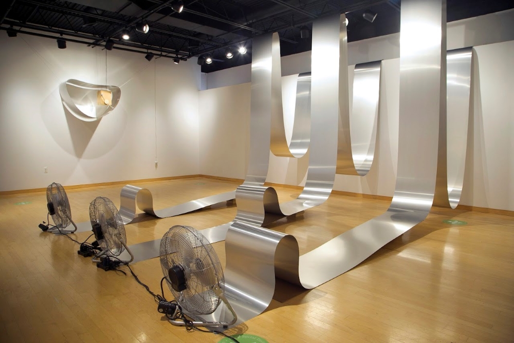 This work describes a surreal and poetic night-sea view that resonates with people of different locations. Aluminum sheets and programmed fans create a live moving percussive environment of waves. These constructions become a contemporary landscape where space is a physical material as much as a piece of metal or wood etc.